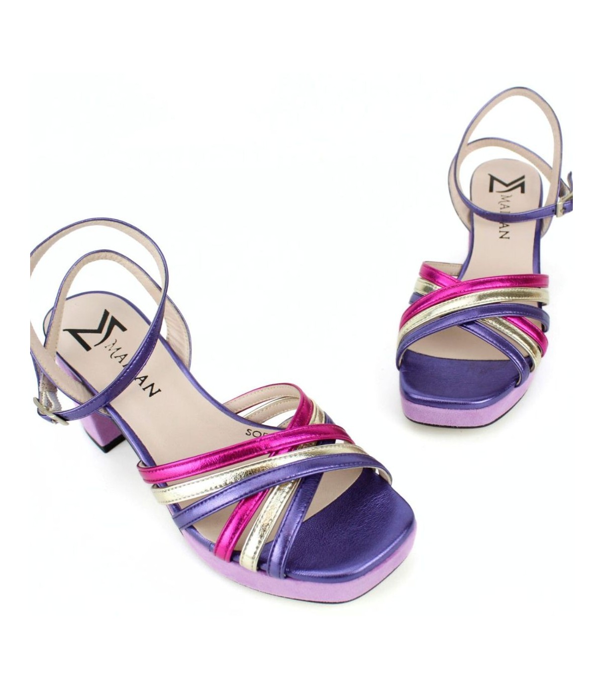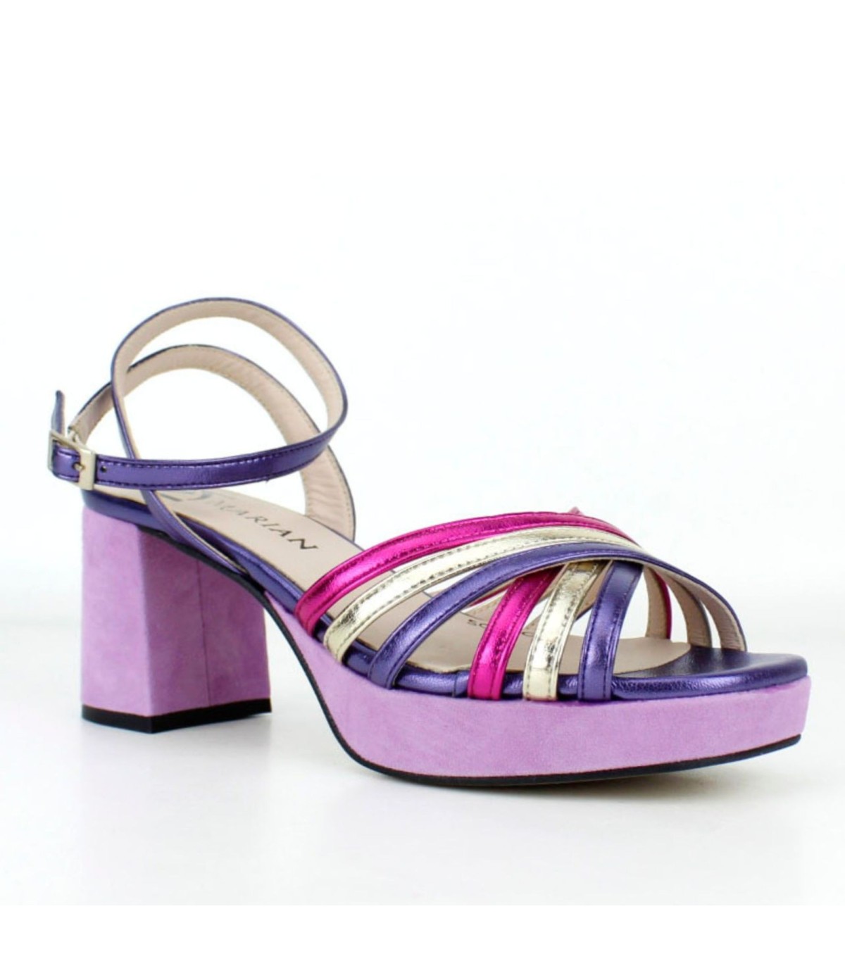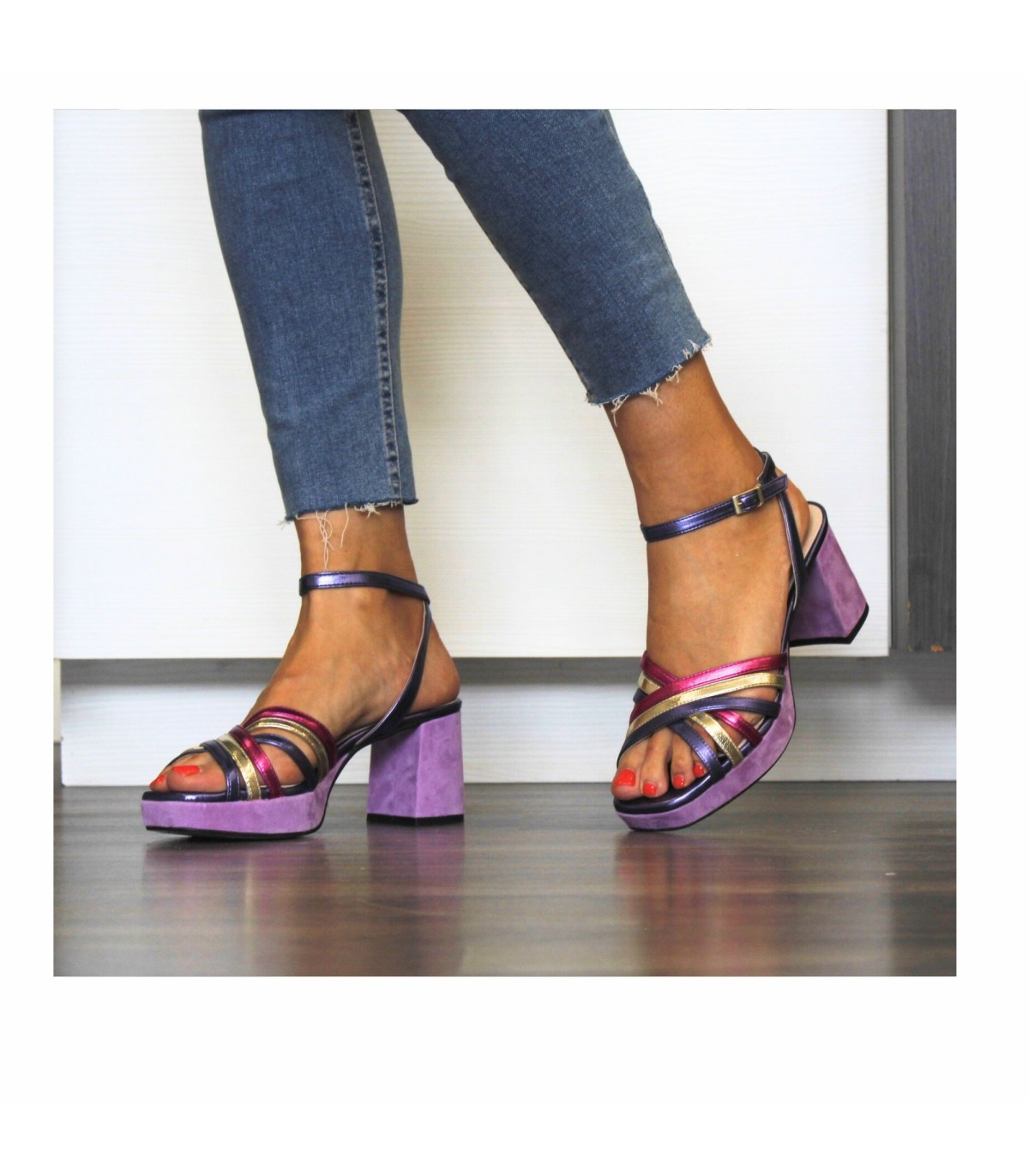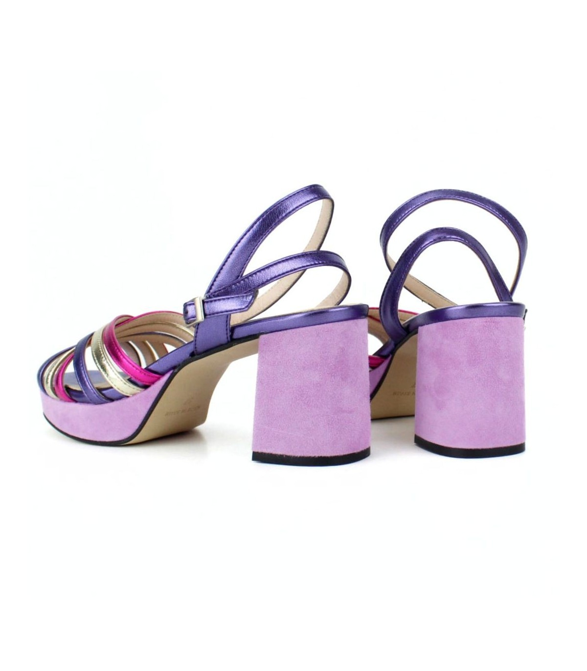 Exclusiva sandalia en mestizo glicine o en tonos dorados combinados con lino y anudada al tobillo. Tacón 6 cm. Forro interior de piel. Con planta de gel, que aporta comodidad en tu pisada.